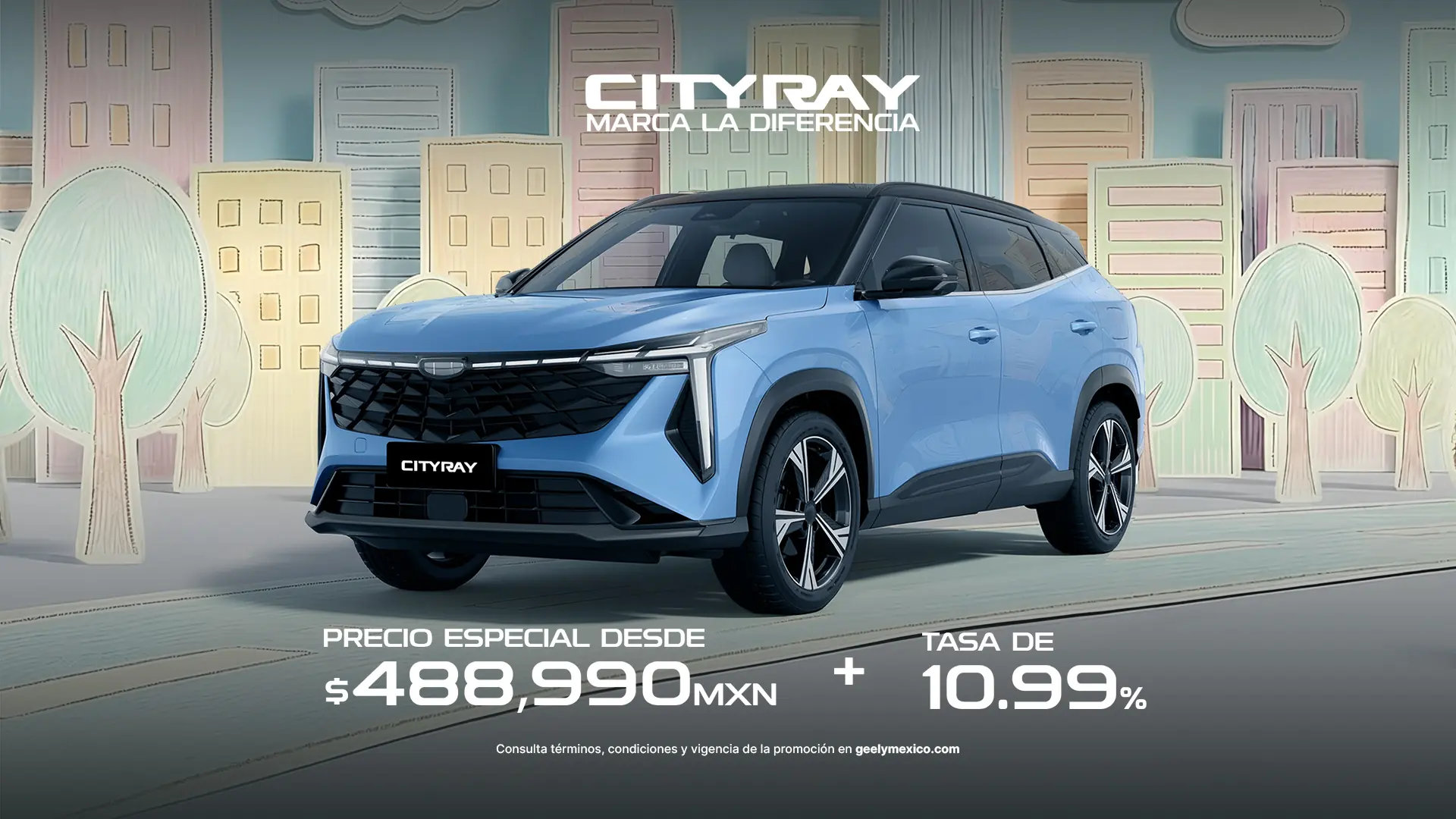 El precio especial de $488,990 aplica únicamente con el plan de crédito simple, a través de Geely Financial Services (BBVA México S.A., Institución de Banca Múltiple), para el modelo Cityray 2026 en su versión GL sobre un precio de $488,990 MXN, con un enganche desde 50%, sobre un importe promedio a financiar de $244,495 MXN a un plazo promedio de 72 meses y tasa de interés ordinaria fija anual sin IVA del 10.99%. Esta oferta no incluye el costo del seguro, mismo que podrá ser cubierto de contado o financiado, conforme a lo estipulado en su contrato, y no es acumulable con otras promociones. Monto de la mensualidad publicada incluye IVA e impuestos. Aplica 2.5% de comisión por apertura en plan BASE.