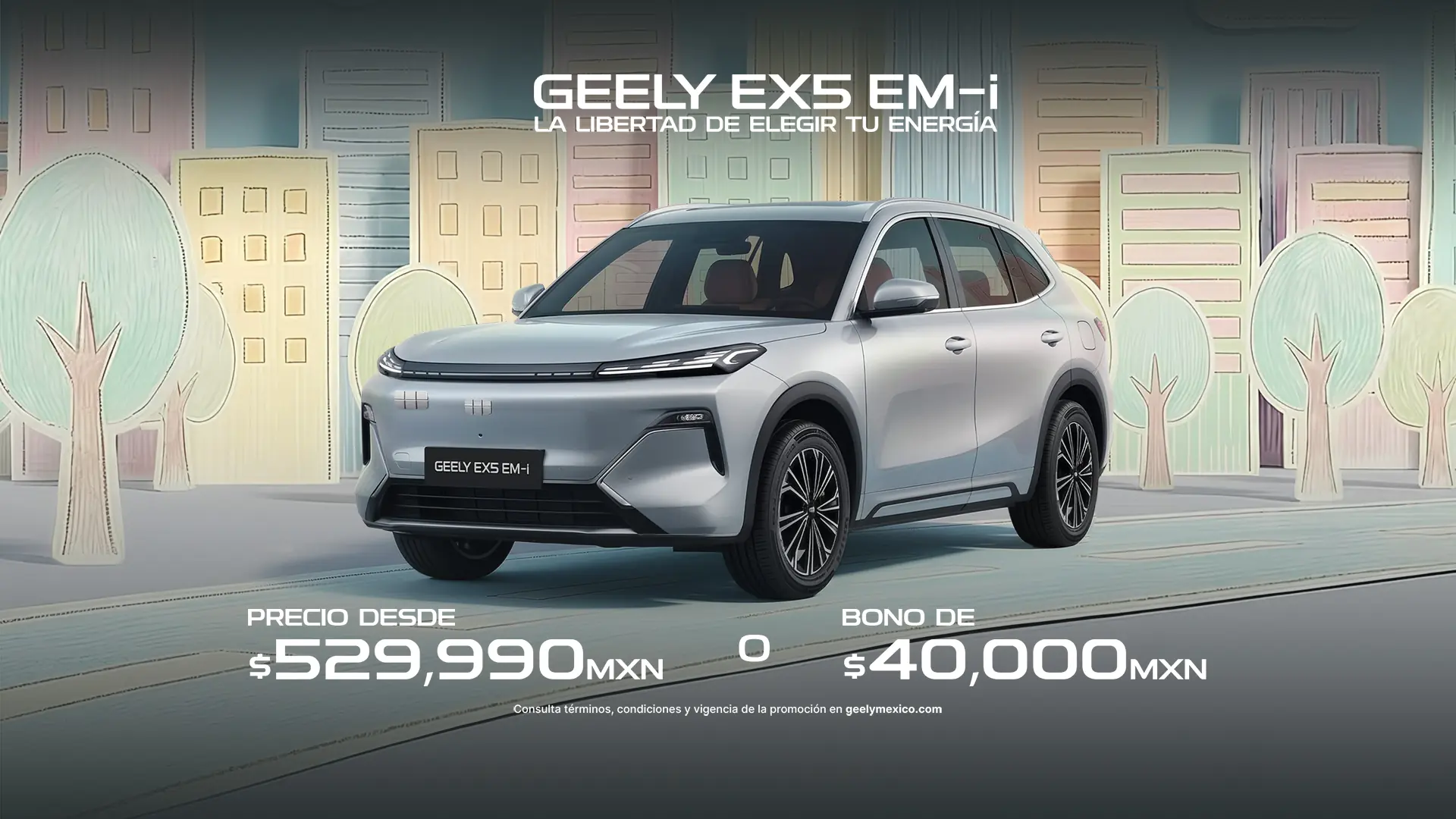 El precio especial de $529,990.00 MXN aplica en la versión Geely EX5 EM-i GL, con precio base de $569,990 y se logra aplicando el bono de $40,000.00 MXN al precio. Esta oferta no incluye el costo del seguro, mismo que podrá ser cubierto de contado o financiado, conforme a lo estipulado en su contrato, y no aplica seguro gratis por un año y no es acumulable con otras promociones. Incluye Wallbox, no incluye instalación de este, ni cargador de emergencia ni adaptador.