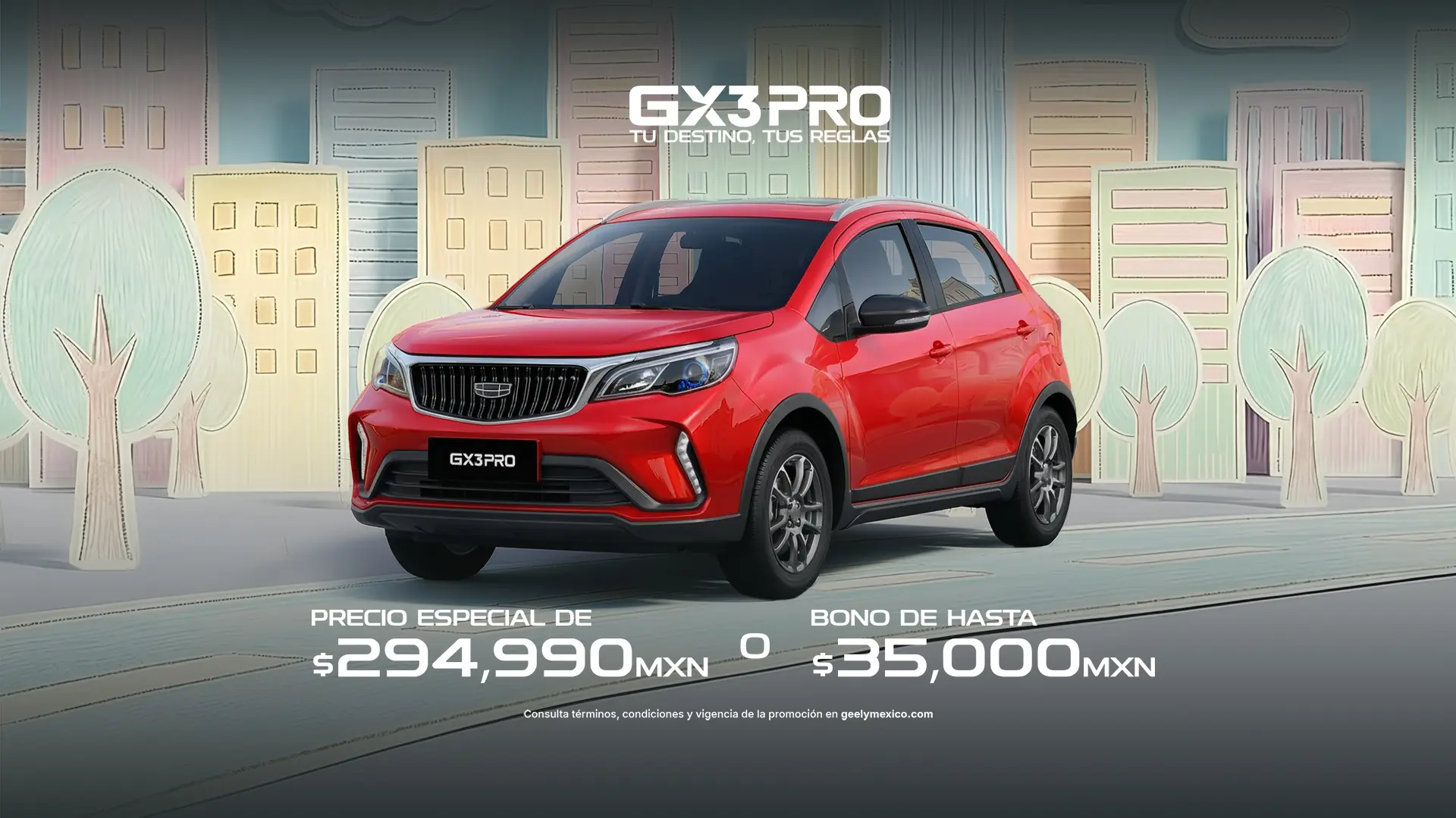 El precio de $294,990 MXN aplica al utilizar el Nuevo Bono Full con el plan de crédito simple, únicamente a través de Geely Financial Services (BBVA México S.A., Institución de Banca Múltiple), para el modelo GX3 Pro 2025 y 2026 en su versión GC, sobre un precio de $329,990 MXN El Nuevo Bono a precio de $35,000 MXN (IVA Incluido no aplica seguro por un año gratis, y no es acumulable con otras promociones. Aplica 2.5% de comisión por apertura en plan BASE o 0% comisión por apertura utilizando el plan CAMP.