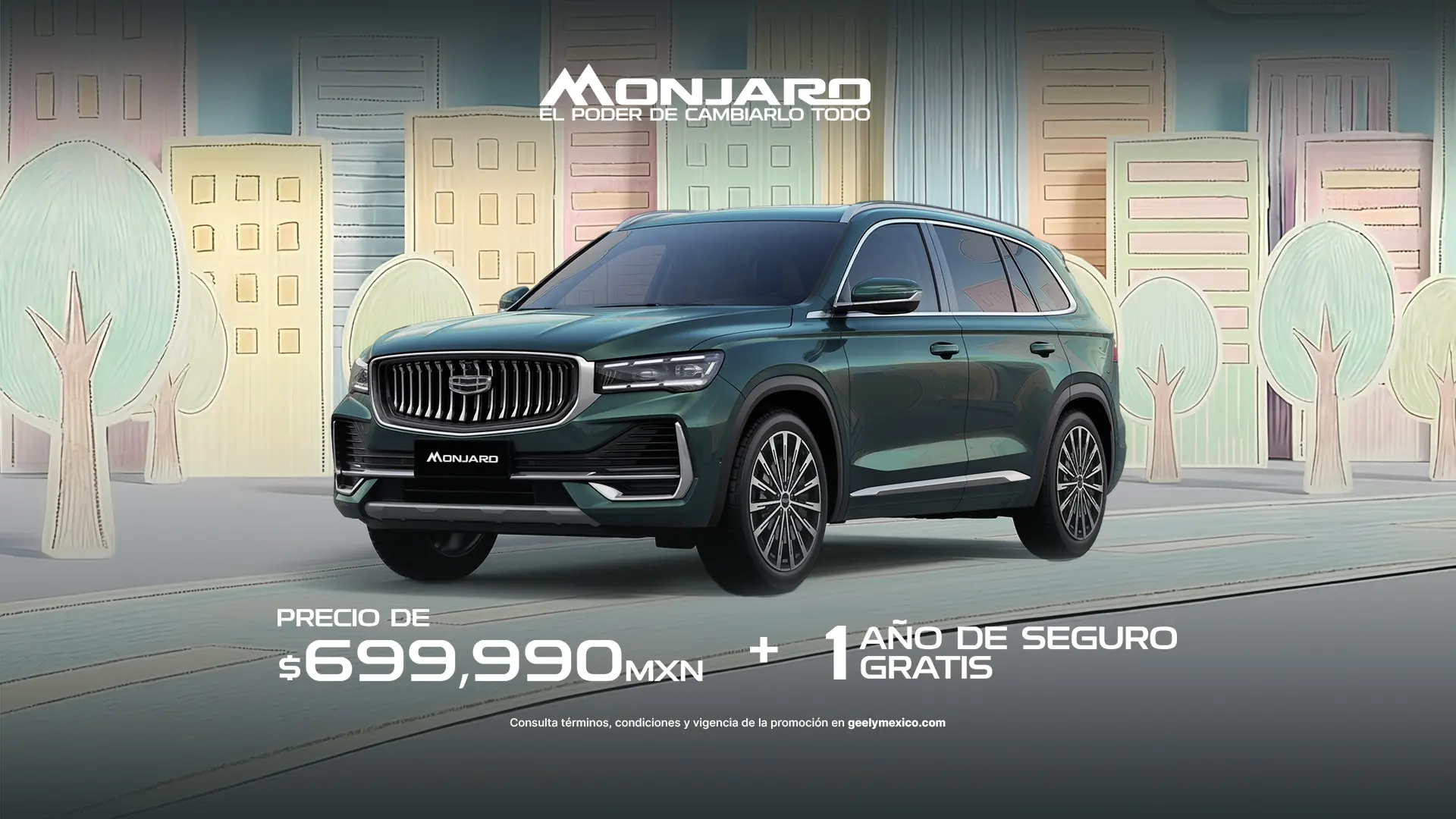 El año de seguro gratis aplica únicamente para el modelo Monjaro 2026 en su versión GF, en operaciones de crédito a través de Geely Financial Services (BBVA). Válido solo con aseguradoras participantes. Consulta especificaciones y condiciones con tu Distribuidor autorizado Geely. Al finalizar el periodo del seguro gratis, el cliente deberá contratar un seguro conforme a lo señalado en su contrato de crédito.