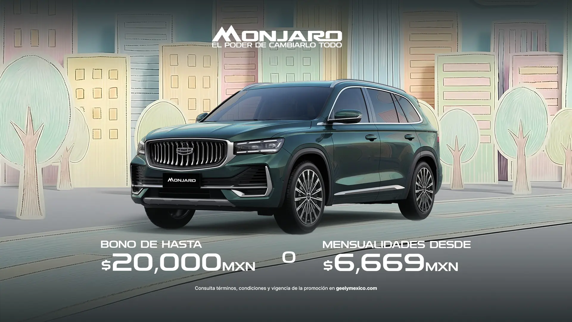 - La mensualidad desde $6,669.00 MXN aplica únicamente con el plan de crédito simple, a través de Geely Financial Services (BBVA México S.A., Institución de Banca Múltiple), para el modelo Monjaro GF 2026, con un enganche desde 51 %, sobre un importe promedio a financiar de $342,995.10 MXN a un plazo promedio de 72 meses y tasa de interés ordinaria fija anual sin IVA del 9.15% utilizando el bono flexible de $20,000 MXN sin Iva para Subsidio a Tasa. Esta oferta no incluye el costo del seguro, mismo que podrá ser cubierto de contado o financiado, conforme a lo estipulado en su contrato, y no es acumulable con otras promociones. Monto de la mensualidad publicada incluye IVA e impuestos. Aplica 2.5% de comisión por apertura en plan BASE.