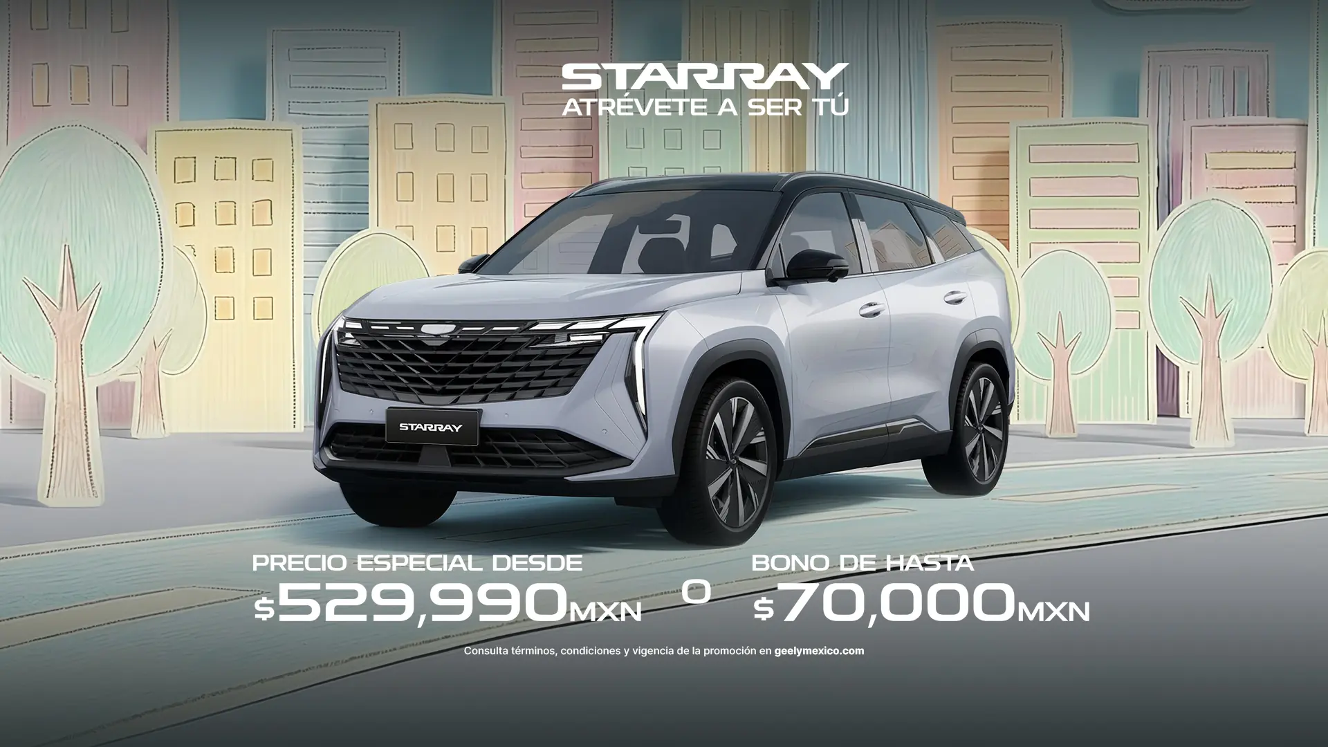 El precio especial de $529,990 MXN aplica al utilizar el bono de $70,000 a precio. Aplica únicamente a través de Geely Financial Services (BBVA México S.A., Institución de Banca Múltiple), para el modelo Starray 2026 en su versión GL 2.0T, sobre un precio de $599,990 MXN bono aplicado a precio es de $70,000 MXN (IVA Incluido no aplica seguro por un año gratis, y no es acumulable con otras promociones. Aplica 2.5% de comisión por apertura en plan BASE o 0% Comisión por apertura utilizando el plan CAMP