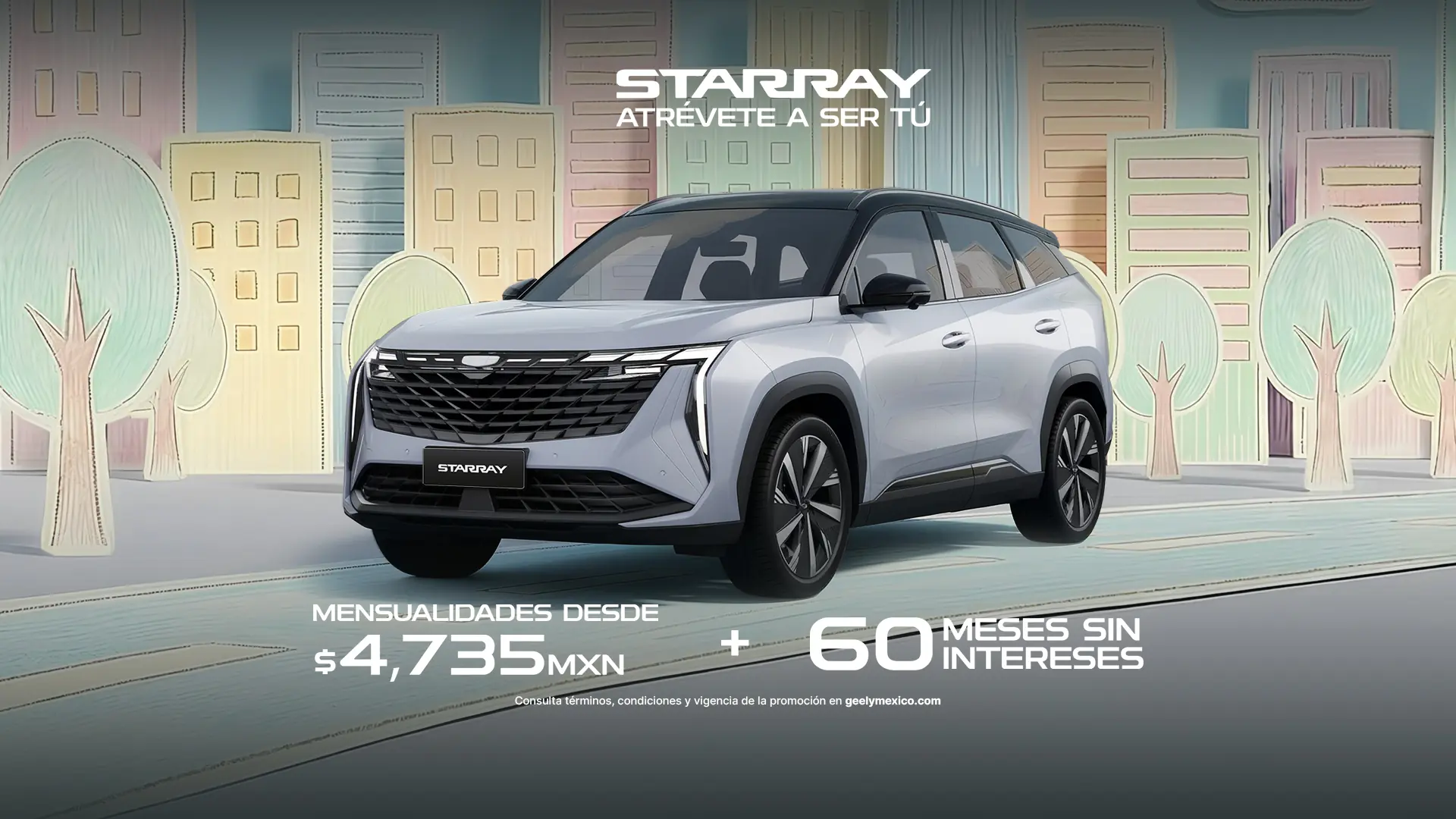 - Los 60 meses sin interés aplica únicamente con el plan de crédito simple, a través de Geely Financial Services (BBVA México S.A., Institución de Banca Múltiple), para el modelo Starray 2026 en su versión GL 2.0T, a partir de un enganche desde 60.66%, a un plazo promedio de 60 meses y tasa de interés ordinaria fija anual sin IVA del 0% utilizando plan Base. El bono de $70,000 sin IVA se usará subsidio. Esta oferta no incluye el costo del seguro, mismo que podrá ser cubierto de contado o financiado, conforme a lo estipulado en su contrato, y no es acumulable con otras promociones. Monto de la mensualidad publicada incluye IVA e impuestos. Aplica 2.5% de comisión por apertura en plan BASE. No aplica seguro por un año gratis con bono completo, y no es acumulable con otras promociones.